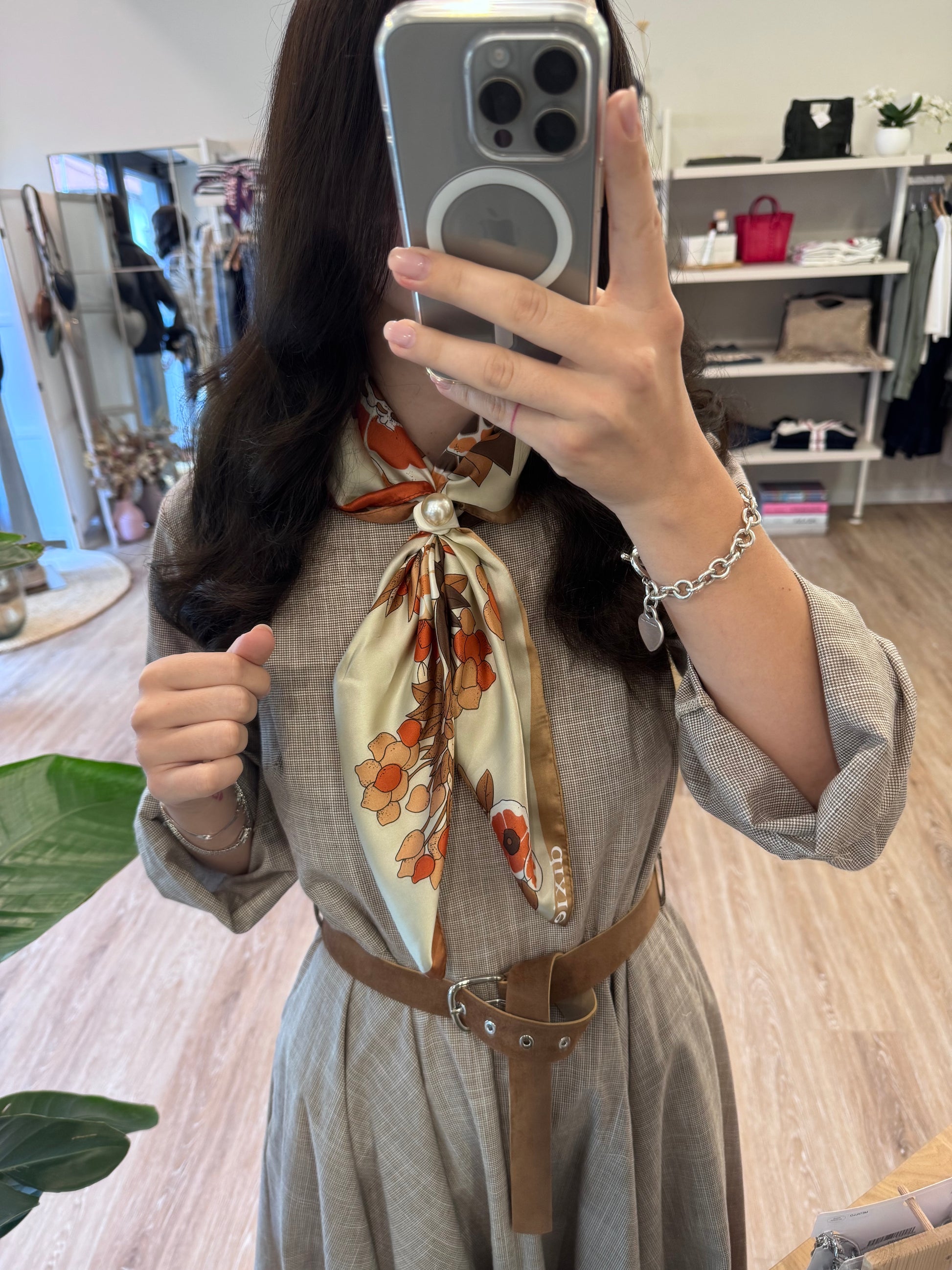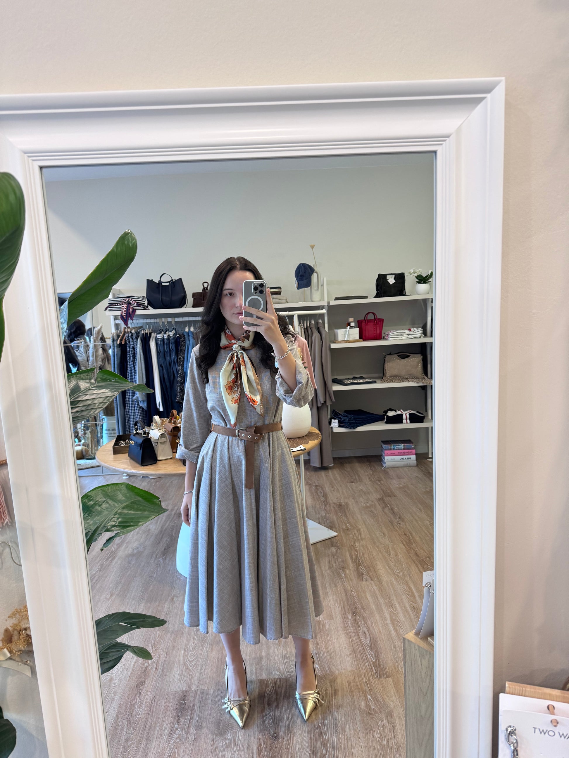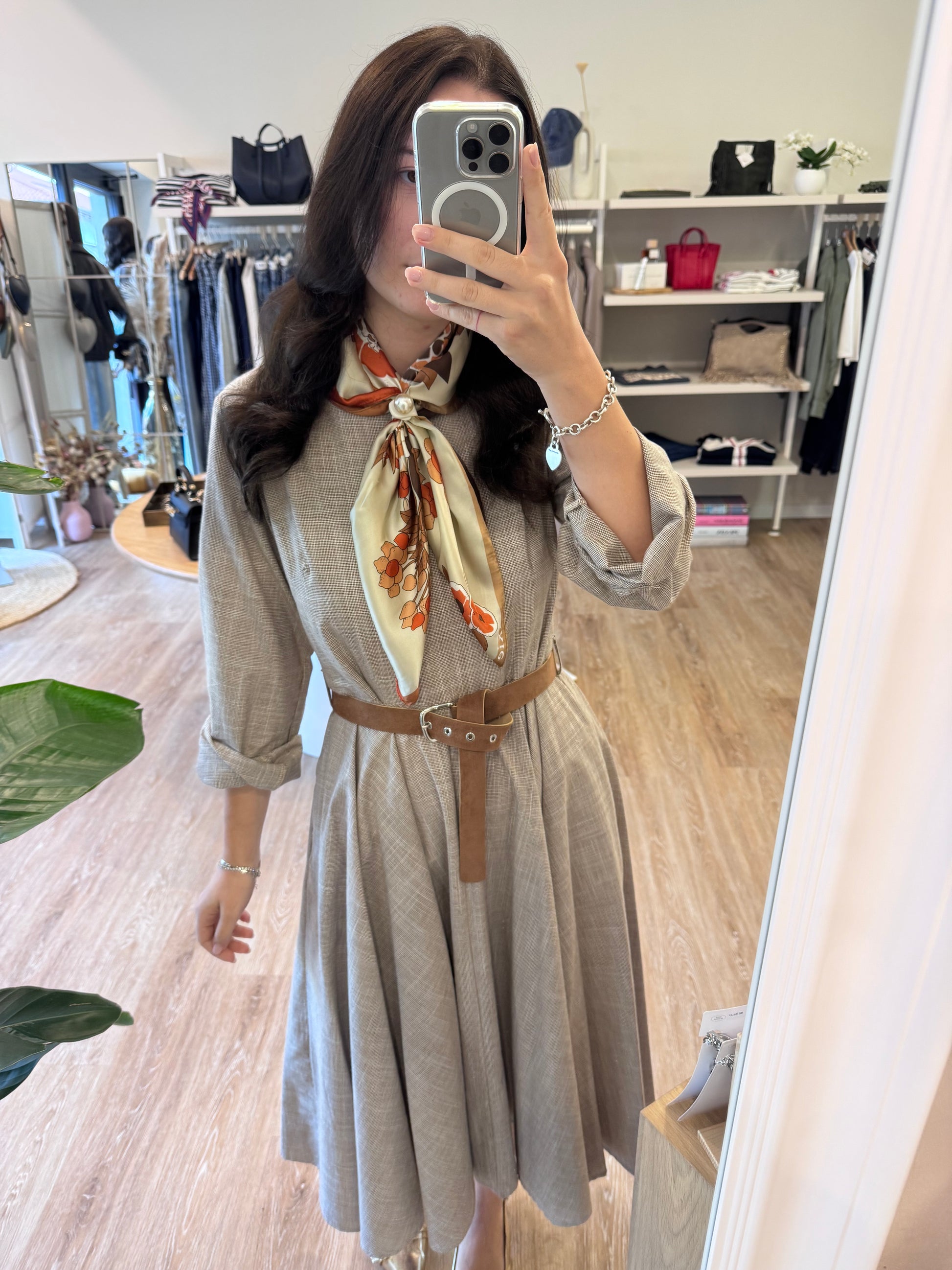Abito con gonna svasata e manica lunga , cintura e foulard loggato inclusi.