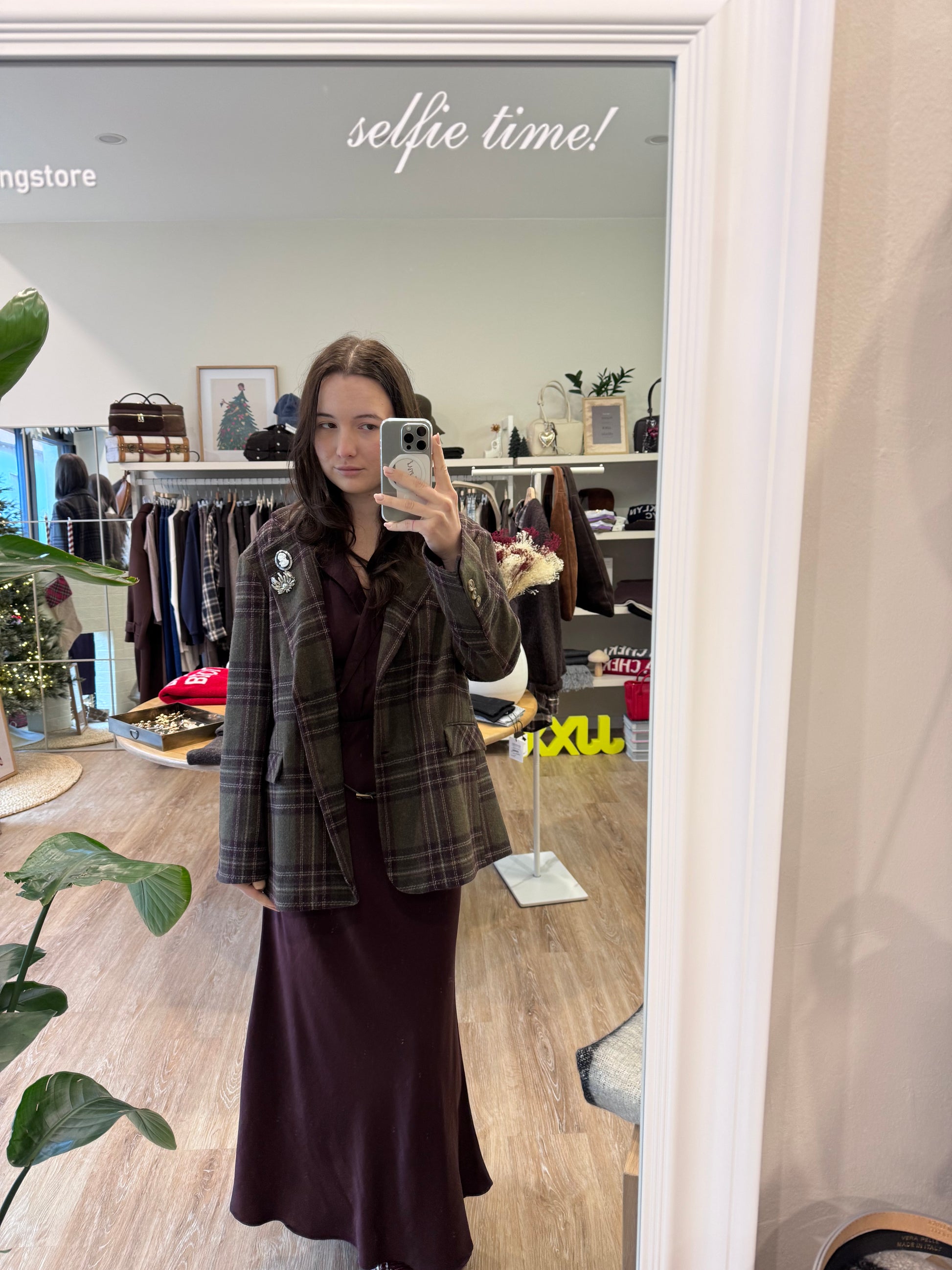 Blazer con fantasia scozzese 70% lana , spille applicate sul bavero