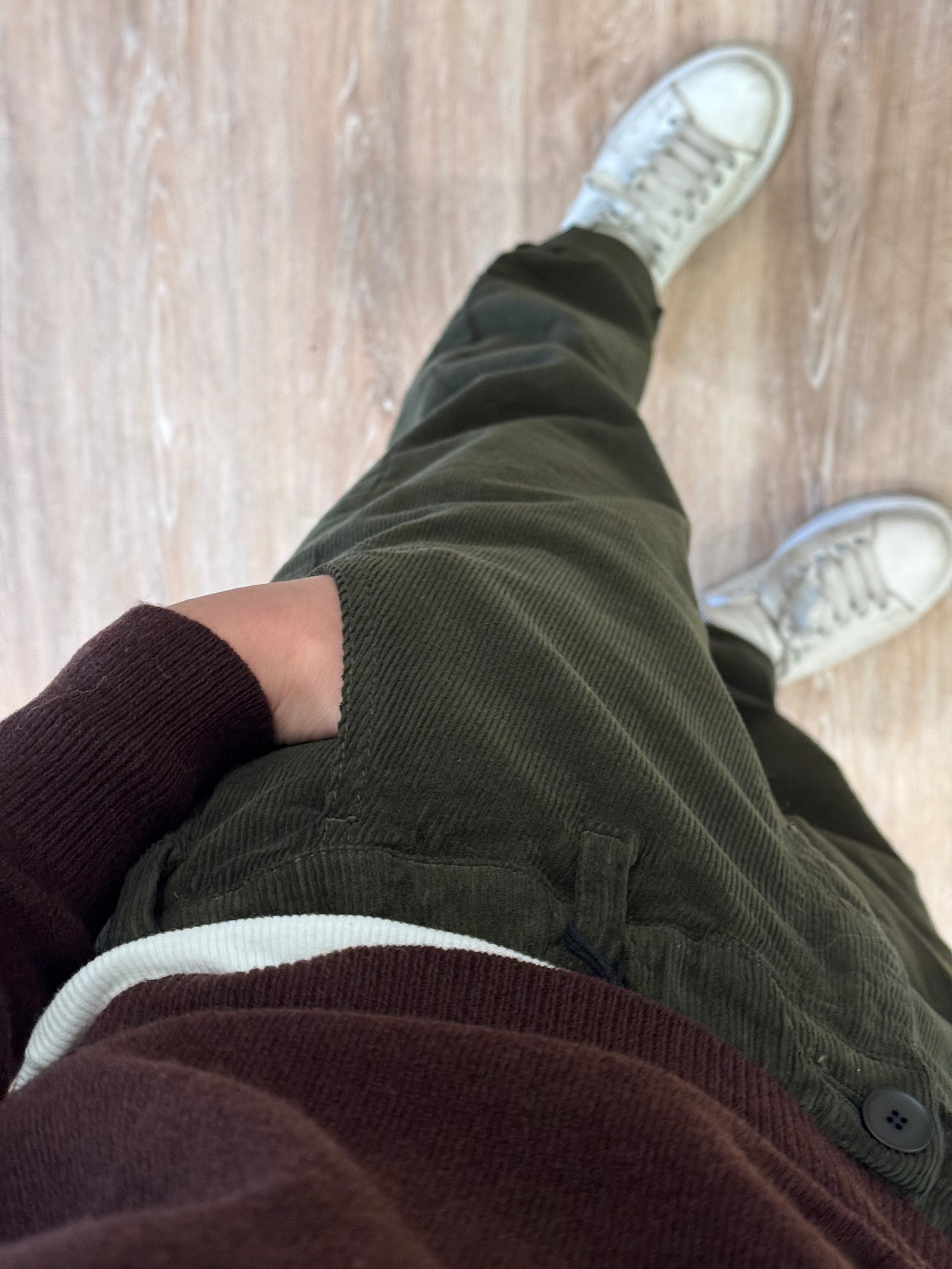 Pantalone in velluto a coste con bottone ed elastico su tutta la vita. Charms attaccato